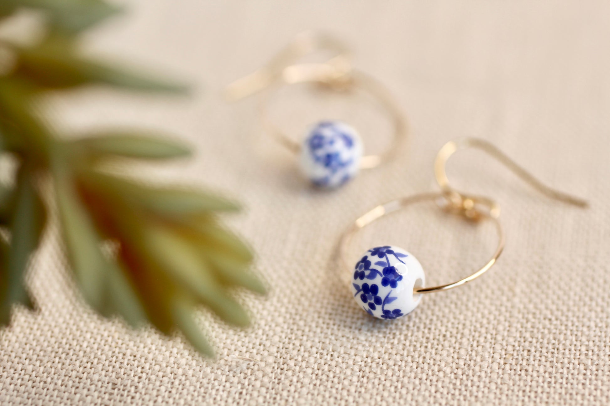 These best-selling earrings feature a vibrant blue floral design on 8mm porcelain beads. Each pair is hand-bent from 14k gold filled wire.