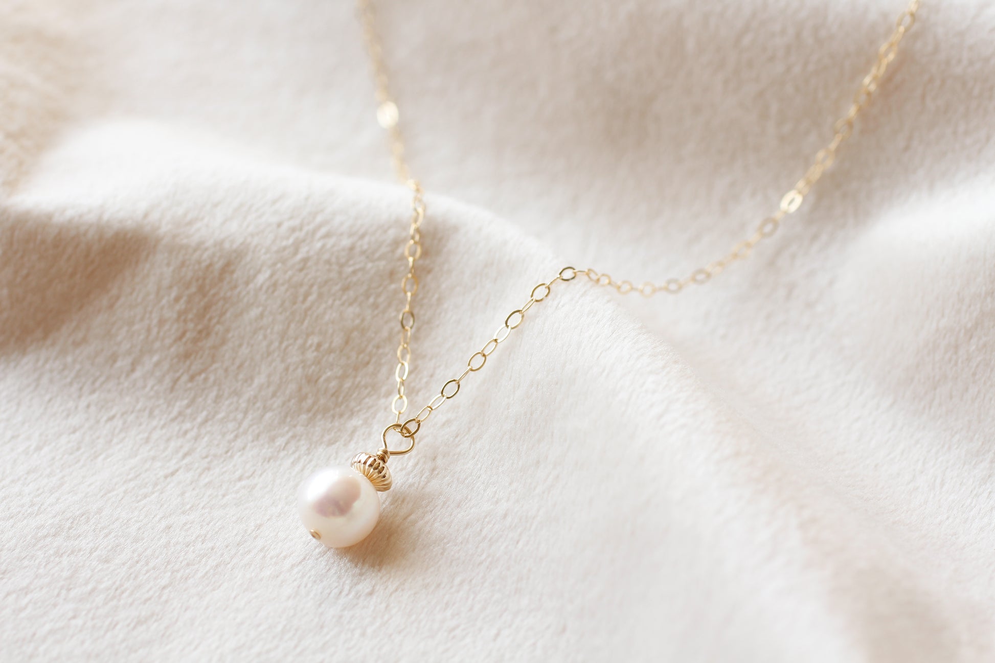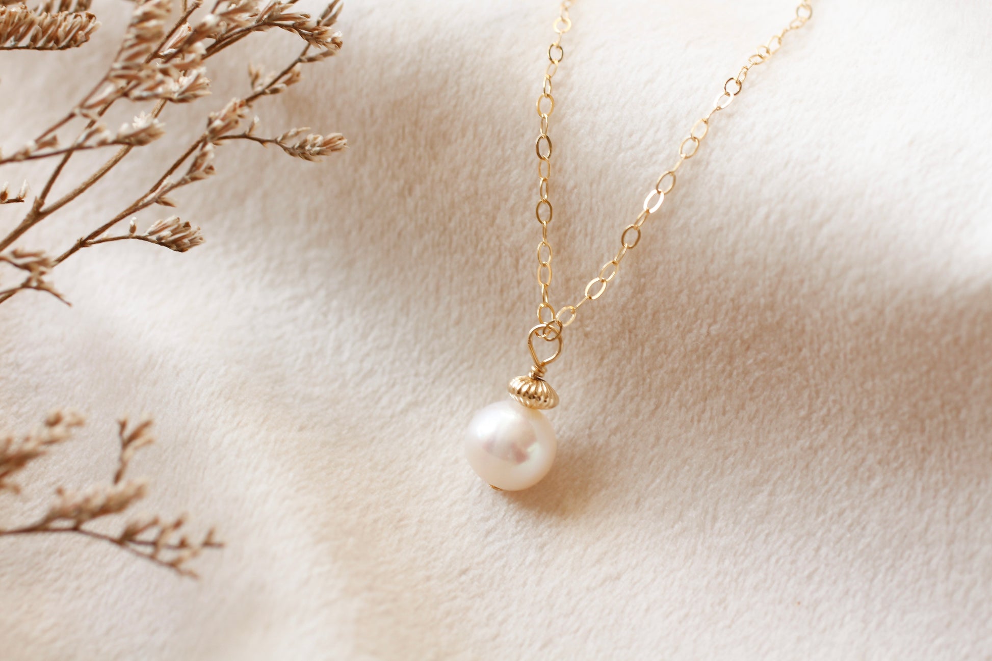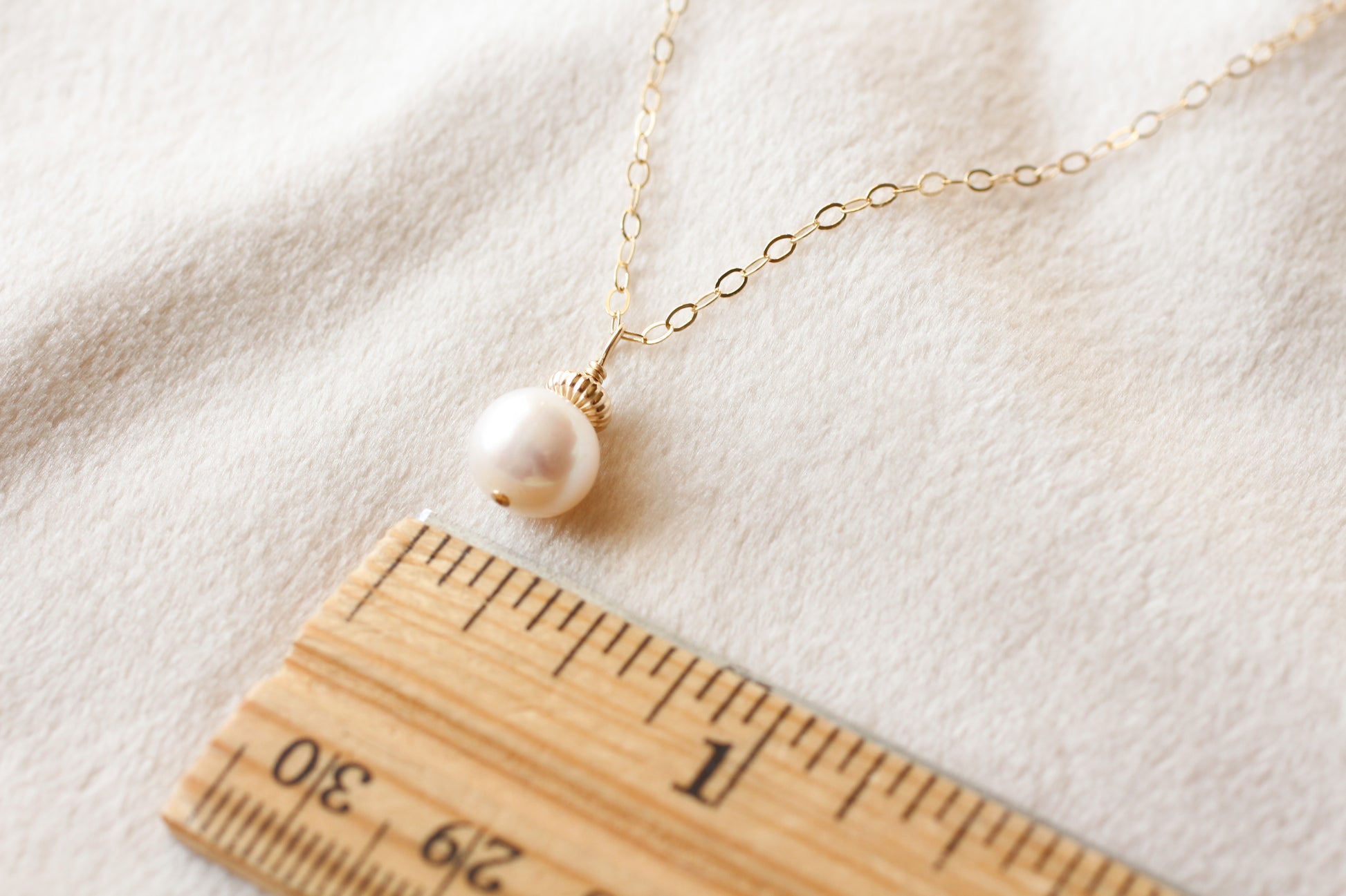 This freshwater pearl necklace is a customer favorite! The fluted gold filled bead at the top of the pearl adds a touch of modern style to this classic design.