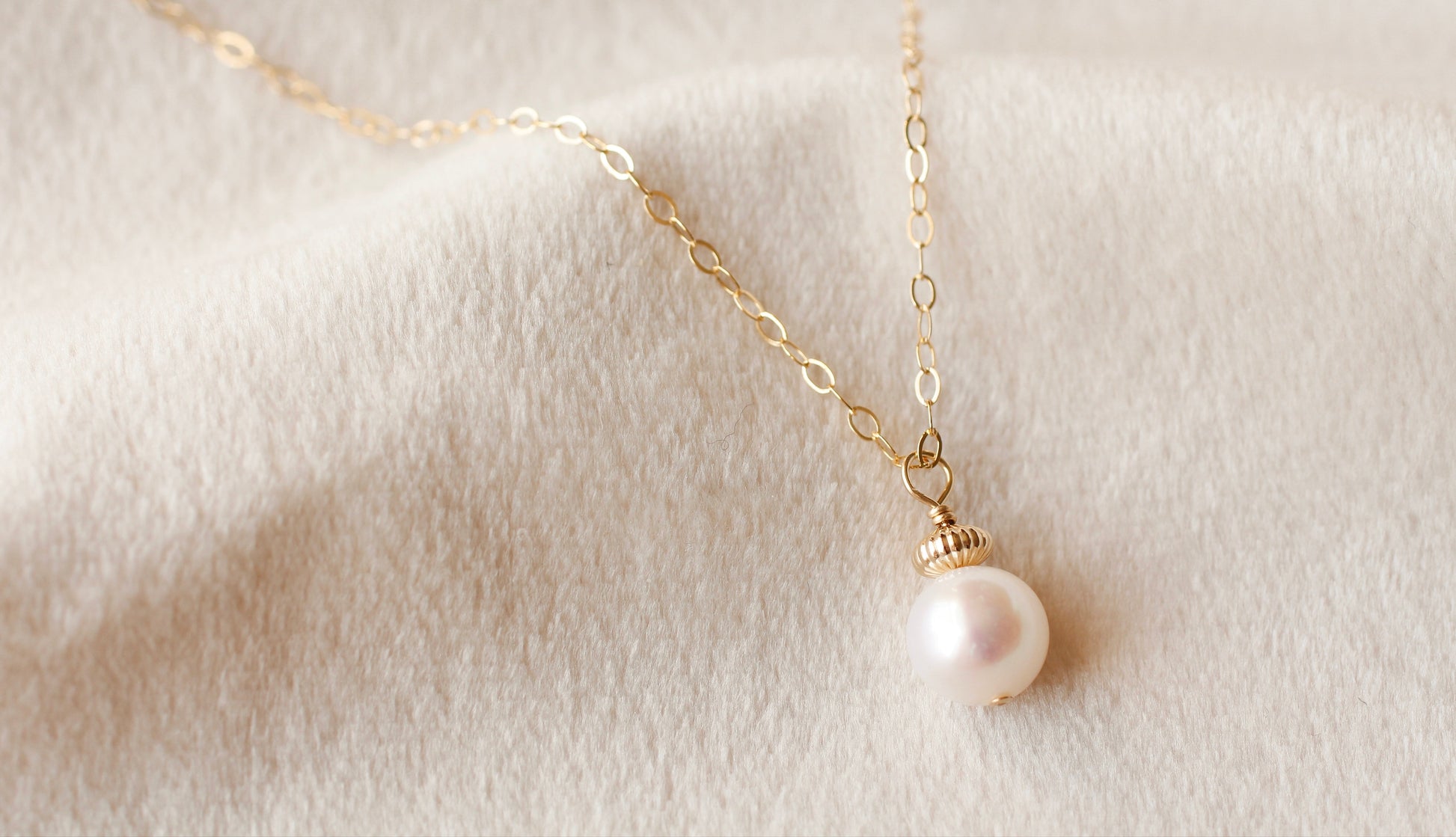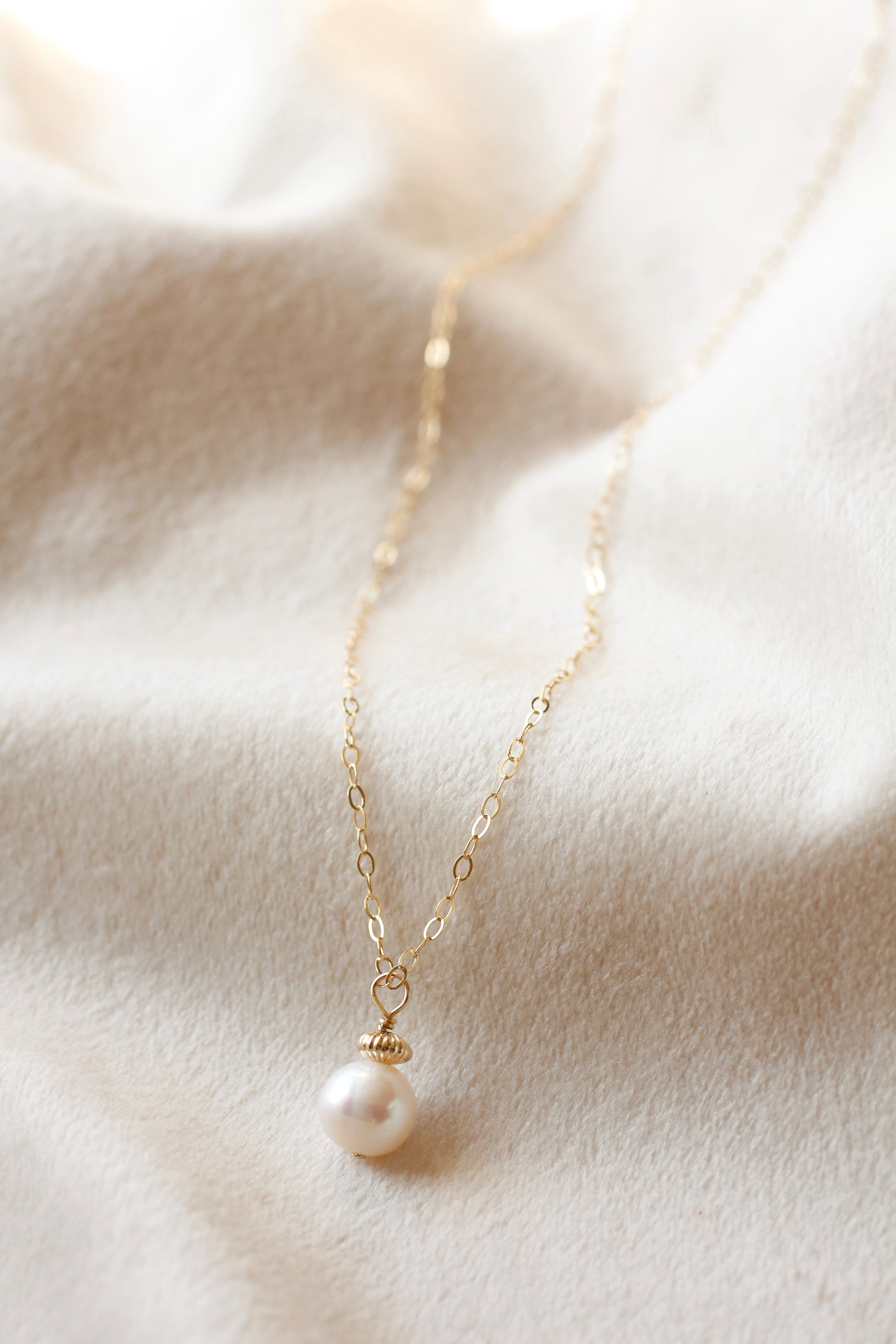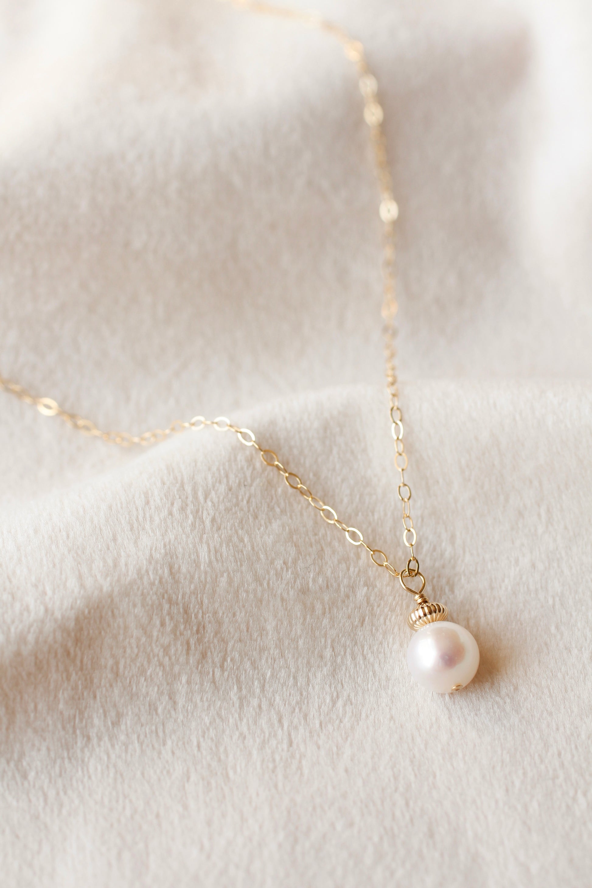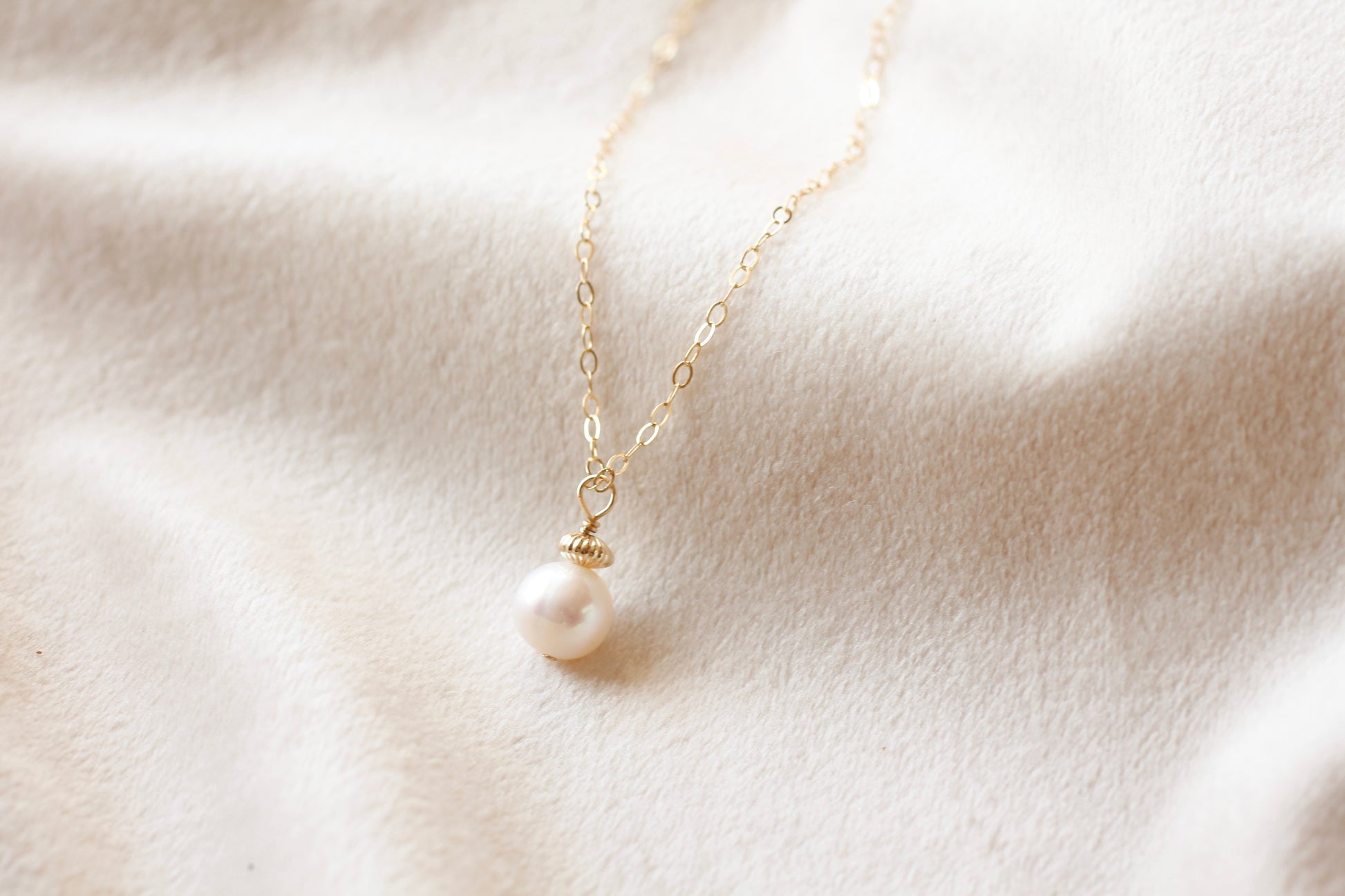 This freshwater pearl necklace is a customer favorite! The fluted gold filled bead at the top of the pearl adds a touch of modern style to this classic design.